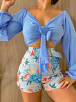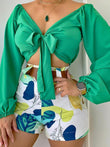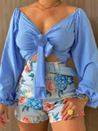 Long Sleeve Crop Top Suit Tie-up Bow V Neck Blouse Shirt And High