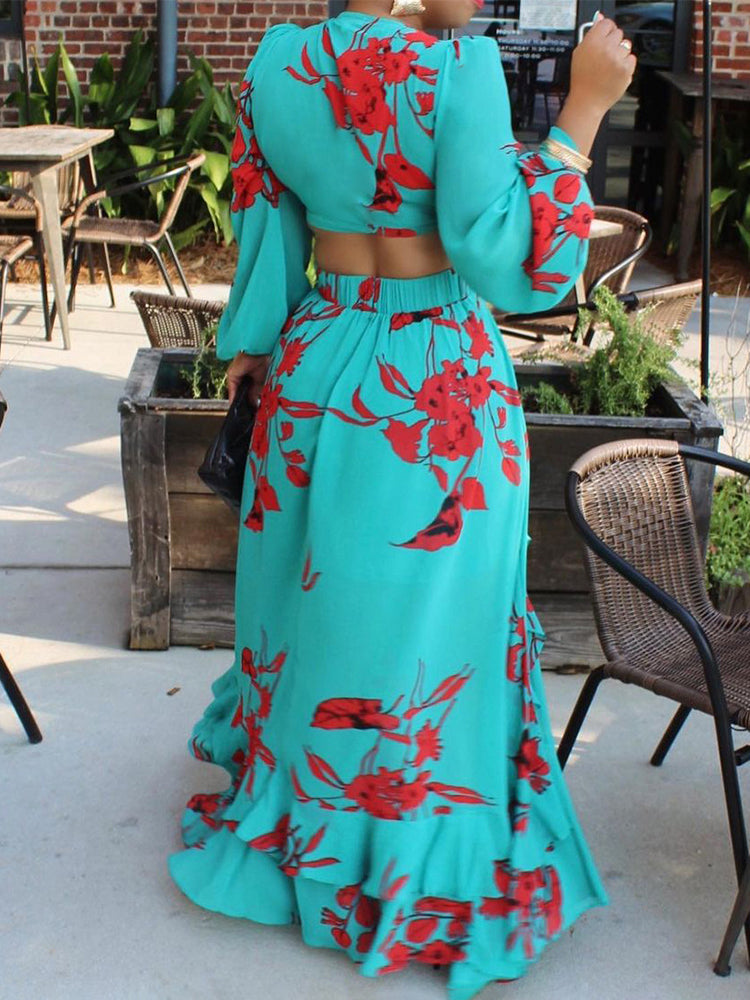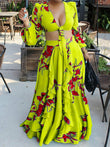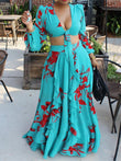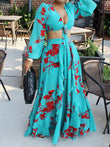 Two Piece Elegant Dress Suits Long Sleeve Tie Up Crop Top & Maxi Skirt