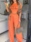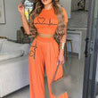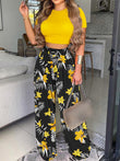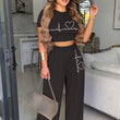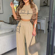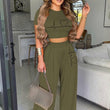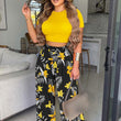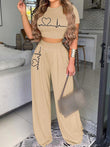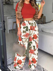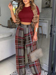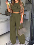 A trendy and flattering outfit featuring a form-fitting crop top and flowy high-waisted trousers.