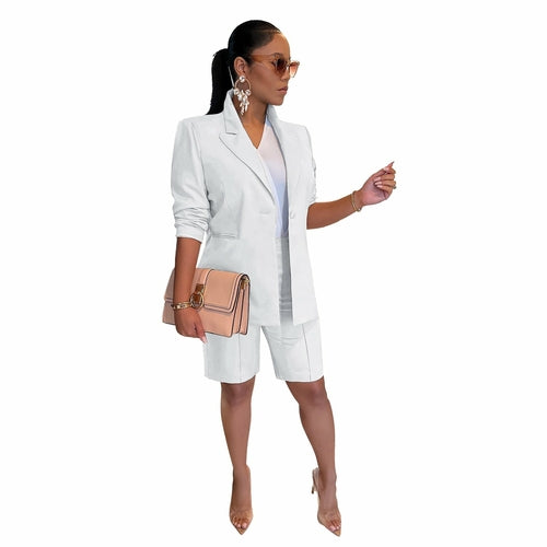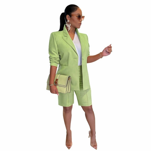 This stylish suit set includes a jacket and shorts, perfect for a casual yet fashionable look. The breathable and comfortable fabric makes it ideal for spring and summer wear. The versatile design allows for mix and match with other wardrobe pieces, making it a great addition to any fashion-conscious woman's wardrobe. Perfect for a day out with friends or a casual work setting.